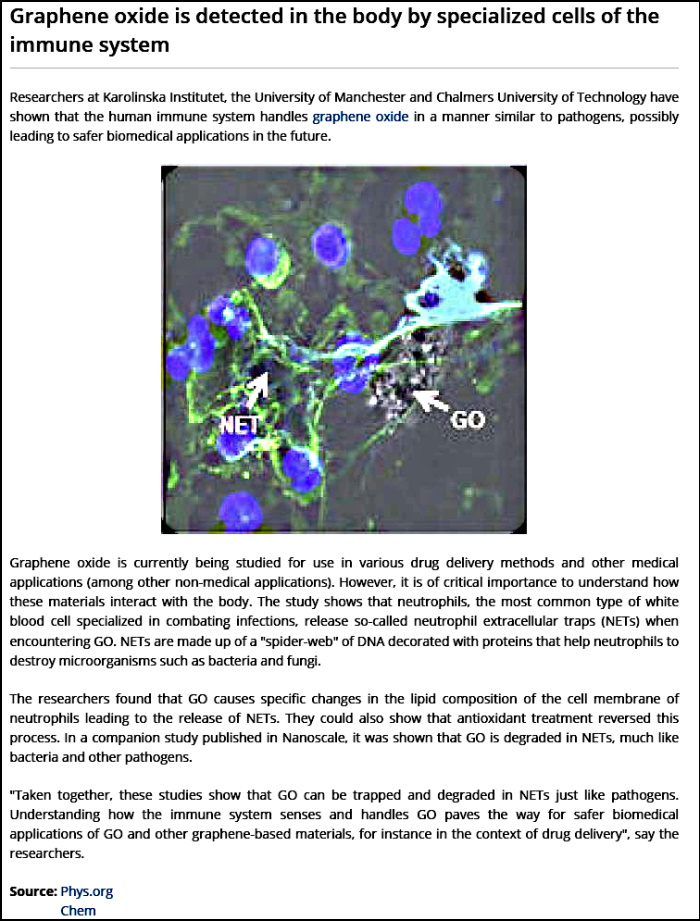 Let op deze bevinding: grafeenoxide in het lichaam veroorzaakt trombogeniciteit, trombi. Grafeenoxide in het lichaam veroorzaakt bloedstolling. Grafeenoxide in het lichaam veroorzaakt post-inflammatoir syndroom of systemische of multi-orgaanontstekingen. Grafeenoxide in het lichaam wanneer het boven de niveaus van glutathion is - wat de natuurlijke reserve van antioxidanten van het lichaam is - veroorzaakt verandering van het immuunsysteem, ineenstorting van het immuunsysteem en cytokinestorm. Geïnhaleerd grafeenoxide verspreidt zich gelijkmatig door het alveolaire kanaal en veroorzaakt bilaterale longontstekingen. Ingeademd grafeenoxide veroorzaakt ontstekingen van de slijmvliezen en daarmee smaak- en reukverlies, mogelijk verlies van smaak en reuk: anosmie.